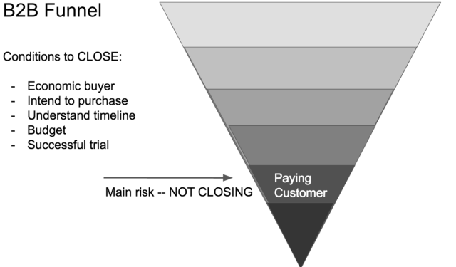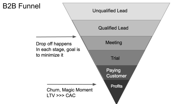 Sales are the bread and butter of B2B and are pretty well understood. When you are starting a new company, you don’t know in advance what YOUR sales funnel will look like. Once you become a real business, you will have a lot of predictability and control over your sales by mastering and optimizing your sales funnel.