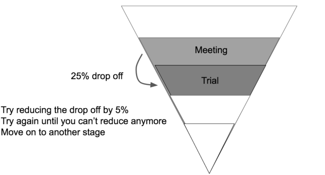 Focus on one stage and try to improve the drop-off by a little bit. Set a small goal and hit it. For example in the picture below, try to improve drop-off between the Meeting and Trial stages by 5%. If you succeed in tuning it, do not stop—keep going.
