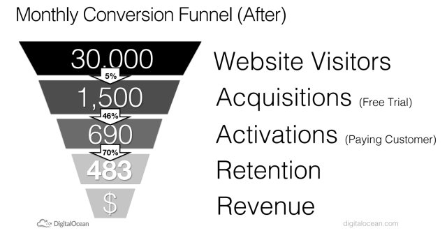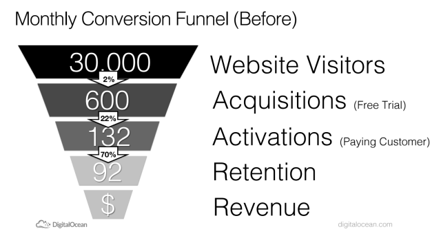 Below is an example of how Digital Ocean (Techstars ’12) was able to dramatically improve their conversion funnel by tuning one stage at a time.