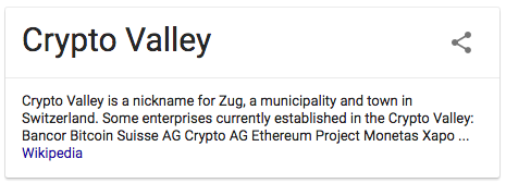 For a cryptocurrency enthusiast living in New York, few things are as lame as going to a crypto related website (e.g. Shapeshift, Kracken, Poloniex..) and reading “… can be used everywhere except in New York and North Korea.” WTF. The Google result for CryptoValley yields: