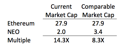 This analysis indicates that NEO has 70% upside levels if it trades at the same comparable market cap multiple to Ethereum as Baidu trades at in comparison to Google. This simplistic analysis has multiple potential flaws (e.g. is Ethereum fairly valued, is Baidu a good comp to Google, is NEO a good comp to Ethereum). However, the point I’m making, and will continue to make, is that real institutional adoption of cryptocurrency requires the industry to develop generally accepted ways to value cryptocurrency. That’s what I’ll continue to research and write about.