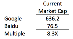 Another way to value cryptocurrencies is to compare them to relevant publicly traded entities. This is known as Comparable Company Analysis in traditional equity analysis. For example, here’s one way to value NEO, which is the 9th most valuable coin at a $1.95B market cap. NEO is up 27,000% to date in 2017 ($10,000 is now $2.7 million). NEO is widely considered to be the “Ethereum of China”, enabling smart contracts and poised to be the go-to platform for what for the expected onslaught of Chinese ICOs. So what should the Chinese Ethereum be worth in relation to Ethereum? Using comparable analysis I started by looking at what the Chinese Google (Baidu) trades at in relation to Google: