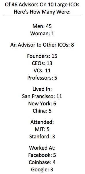 Most companies that have ICO’d have small employee bases that are supplemented by Advisors providing valuable technical or business insight. As ICOs are increasingly been driven by PR, having well known Advisors “..is becoming a must have”. So I analyzed the composition of Advisors at 10 successful ICOs, and found there was tremendous diversity across the advisor base, other than gender. Now, my sampling wasn’t scientific, but one female out 46 Advisors highlights the industry has a gender issue to address. Here’s how the 46 Advisors broke out: