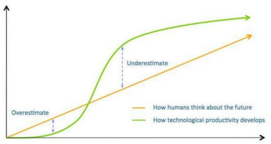 Roy Amara was the President of the Palo Alto based think tank Institute For The Future when he coined Amara’s law: “We tend to overestimate the effect of a technology in the short run and underestimate the effect in the long run”. That’s because humans think in a linear fashion, while technology develops in an “S Curve”: