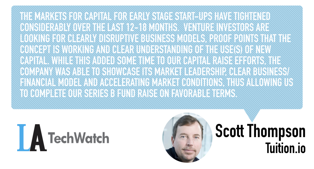 The markets for capital for early stage start-ups have tightened considerably over the last 12-18 months. Venture investors are looking for clearly disruptive business models, proof points that the concept is working and clear understanding of the use(s) of new capital. While this added some time to our capital raise efforts, the company was able to showcase its market leadership, clear business/financial model and accelerating market conditions, thus allowing us to complete our Series B fund raise on favorable terms.