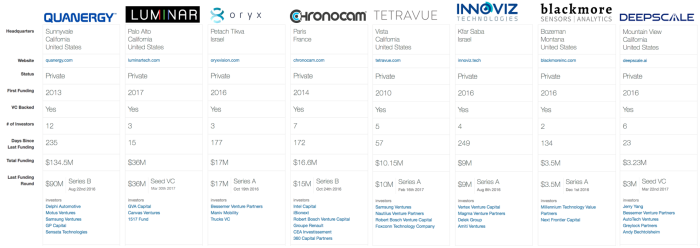 GM is not the first Detroit automaker aiming to reduce the costs of sensors on the road; last year Ford invested $150 million in Velodyne, the leading LIDAR company on the market. Velodyne is best known for its rotation sensor that is often mistaken for a siren on top of the car. In describing the transaction, Raj Nair, Ford’s Executive Vice President, Product Development and Chief Technical Officer, said “From the very beginning of our autonomous vehicle program, we saw LIDAR as a key enabler due to its sensing capabilities and how it complements radar and cameras. Ford has a long-standing relationship with Velodyne and our investment is a clear sign of our commitment to making autonomous vehicles available for consumers around the world.” As the race heats up for competing perception technologies, LIDAR startups is already a crowded field with eight other companies (below) competing to become the standard vision for autonomous driving.
