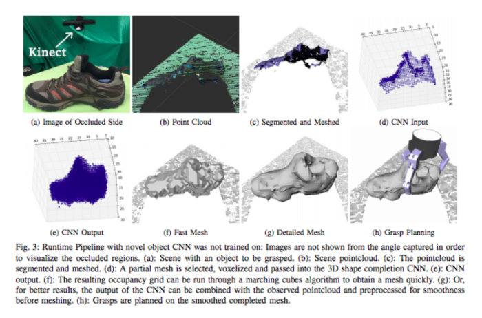 Walking the halls of Columbia University’s engineering school last week, I visited a number of the robotic labs working on the next generation of sensing technology. Dr. Peter Allen, Professor of Computer Science, is the founder of the Columbia Grasp Database, whimsically called GraspIt!, that enables robots to better recognize and pickup everyday objects. GraspIt! provides “an architecture to enable robotic grasp planning via shape completion.” The open source GraspIt! database has over 440,000 3D representations of household articles from varying viewpoints, which makes up its “3D convolutional neural network (CNN).” According to the Lab’s IEEE paper published earlier this year, the CNN is able to serve up “a 2.5D pointcloud” capture of “a single point of view” of each item, which then “fills in the occluded regions of the scene, allowing grasps to be planned and executed on the completed object” (see diagram below). As Dr. Allen demonstrated last week, the CNN is able to perform as successfully in live scenarios with a robots “seeing” an object for the first time, as it does in computer simulations.
