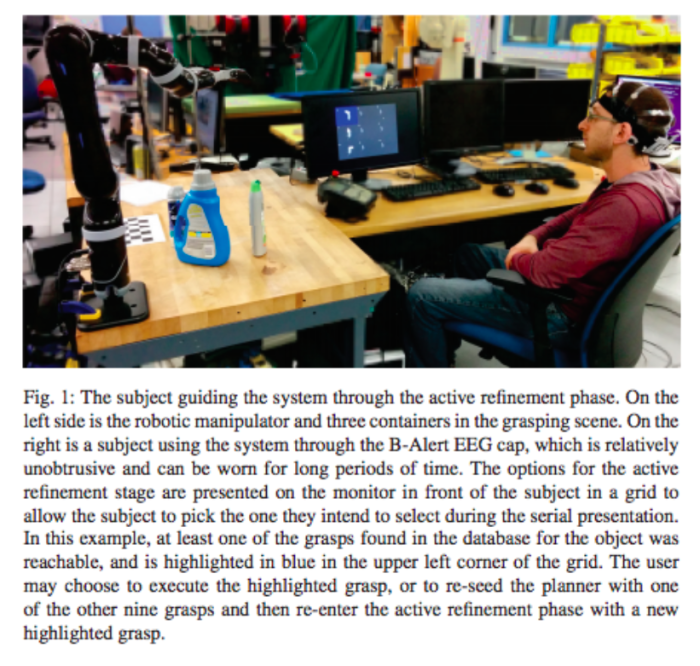 Taking a novel approach in utilizing their cloud-based data platform, Allen’s team now aims to help quadriplegics better navigate their world with assistive robots. Typically, a quadriplegic is reliant on human aids to perform even the most basic functions like eating and drinking, however Brain-Computer Interfaces (BCI) offer the promise of independence with a robot. Wearing a BCI helmet, Dr. Allen’s grad student was able to move a robot around the room by just looking at objects on screen. The object on the screen triggers electroencephalogram (EGG) waves that are admitted to the robot which translates the signals into pointcloud images on the database. According to their research, “Noninvasive BCI’s, which are very desirable from a medical and therapeutic perspective, are only able to deliver noisy, low-bandwidth signals, making their use in complex tasks difficult. To this end, we present a shared control online grasp planning framework using an advanced EEG-based interface…This online planning framework allows the user to direct the planner towards grasps that reflect their intent for using the grasped object by successively selecting grasps that approach the desired approach direction of the hand. The planner divides the grasping task into phases, and generates images that reflect the choices that the planner can make at each phase. The EEG interface is used to recognize the user’s preference among a set of options presented by the planner.”