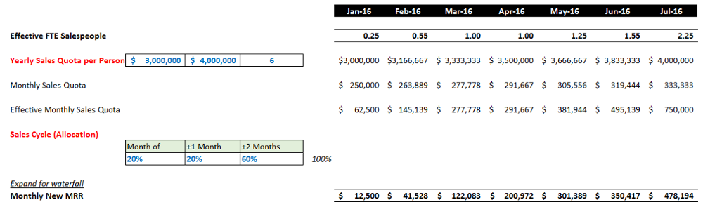 As you can see, the revenue build starts with the number of salespeople in the company. Next, we model out the benefit of adding additional salespeople.