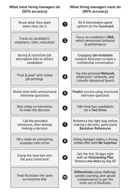 First of all, here is a good summary of the book, featuring the 10 Step Playbook for hiring rockstars. It compares what most recruiters do, and what rockstar recruiters do. Notice the key steps from starting with setting up an upfront scorecard for what will make a great candidate, focusing on the candidates with the right DNA, taking candidates for a test drive, paying special attention during onboarding and pruning mis-hires within the first 60 days, to name a few.