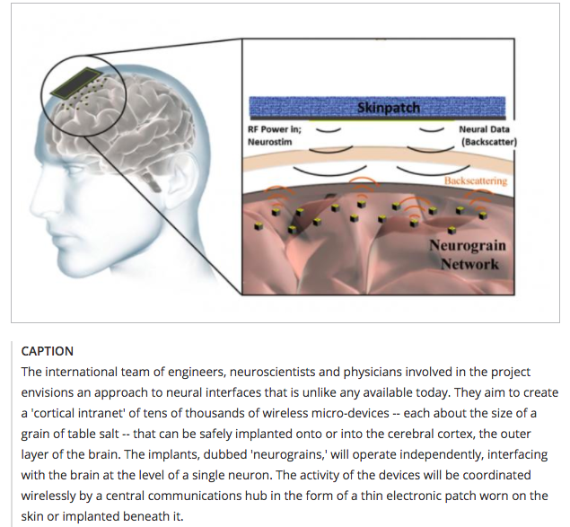 Nurmikko boasts of the numerous medicinal outcomes of the research, “The understanding of the brain we can get from such a system will hopefully lead to new therapeutic strategies involving neural stimulation of the brain, which we can implement with this new neurotechnology.” The technology being developed by Nurmikko’s international team will eventually create a wireless neural communication platform that will be able to record and stimulate brian activity at an unprecedented level of detail and precision. This will be accomplished by implanting a mesh network of tens of thousands of granular micro-devices into a person’s cranium. The surgeons will place this layer of neurograins around the cerebral cortex that will be controlled by a nearby electronic patch just below a person’s skin.