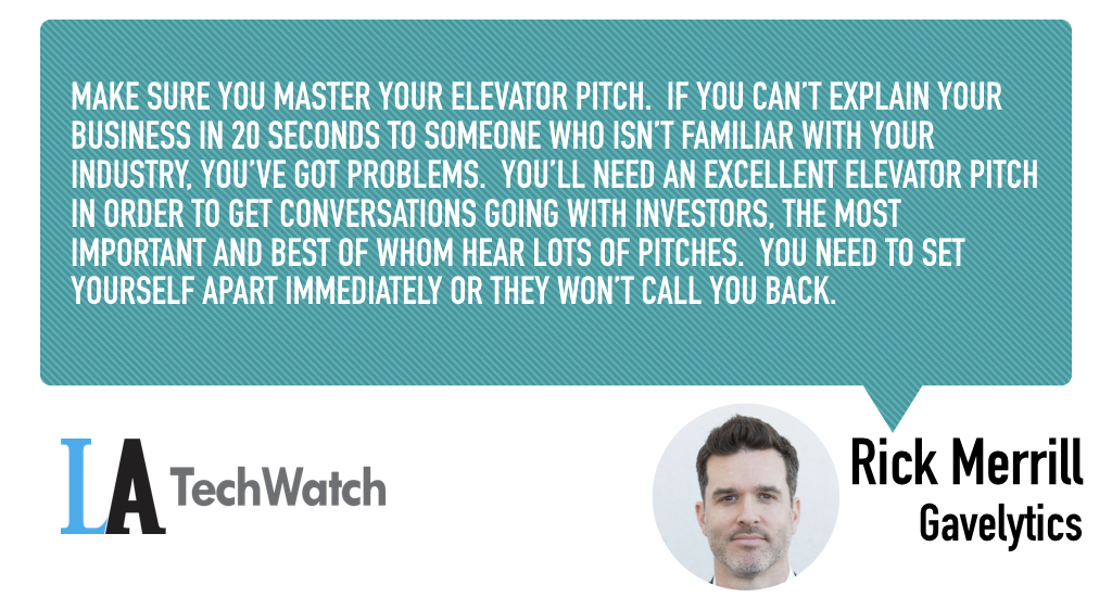 Make sure you master your elevator pitch. If you can’t explain your business in 20 seconds to someone who isn’t familiar with your industry, you’ve got problems. You’ll need an excellent elevator pitch in order to get conversations going with investors, the most important and best of who hear lots of pitches. You need to set yourself apart immediately or they won’t call you back.