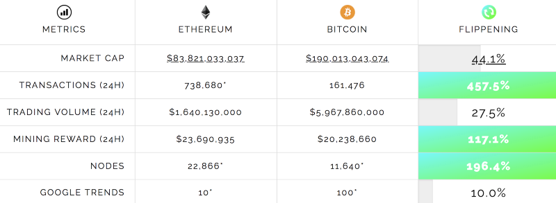 In Cryptoland, “The Flippening” refers to a point in time at which Ethereum overtakes Bitcoin in terms of market capitalization. There are websites dedicated to the “Flippening Watch”: