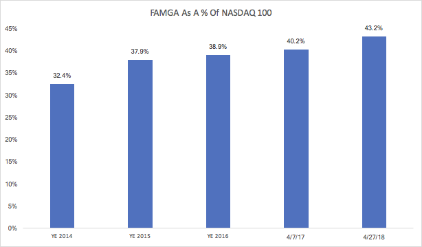 In April last year, I published “The Profound Implications of Five Increasingly Dominant Tech Companies”, which outlined the increasing share of market cap that FAMGA was accounting for of the 100 largest NASDAQ companies by market cap. That trend not only continued over the last year, it accelerated:
