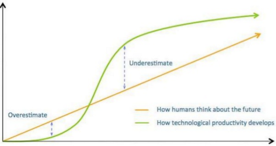 As humans, we think in a liner fashion, but technology adoption follows an S curve, leading to this situation: