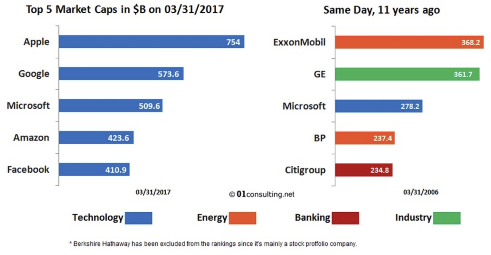 The largest U.S. companies by market cap are all tech. That wasn’t always the case: