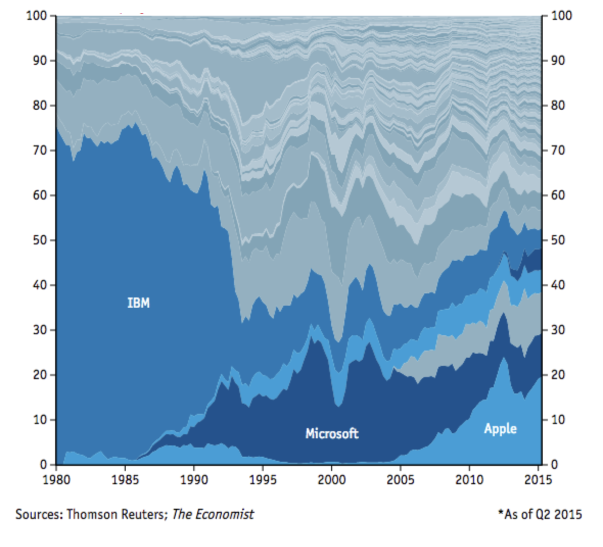 A year ago I didn’t see any emerging technology that could impede the FAMGA’s increasing dominance. But I did state that “History has taught us that nothing is constant but change”, as noted by the great graph below showing the market cap market share of the top 100 tech companies over time: