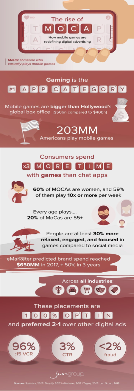 Industry leaders have adopted a new term to better describe this diverse and massive demographic: “MOCA,” an amalgamation of “mobile” and “casual.” More than just changing our terminology, understanding this audience, their habits, and composition, is key to succeeding in an increasingly mobile-first world. To learn more about how brands are discovering new opportunities with mobile games, check out the infographic here.