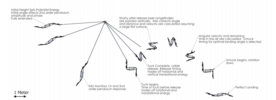 In the words of Dr. Morgan Pope of Disney Research, “We’d like to do something that’s not just human, but beyond human… The hope here is that we’re delivering something physical and tangible, as opposed to virtual and digital.” The research of creating the  “beyond human” could field more important products than just theme-park animatronics. According to Dr. Pope’s research, the “Stickman” (video above)  is a “two-degree freedom robot that uses a gravity-driven pendulum launch and produces a variety of somersaulting stunts.” By leveraging the physics of the streamlined design the robot is able to swing “through the air on a pendulum, ‘tucks’ to change its moment of inertia, releases, ‘untuck;” to reduce its spin, and gracefully lands on its back on a foam mat.” The robot’s dynamics are controlled by “an IMU [inertial measurement unit] and a laser range-finder to estimate its state mid-flight and actuates to change its motion both on and off the pendulum.”