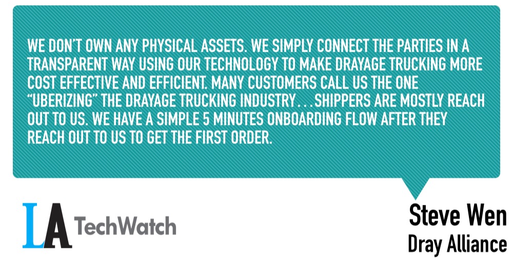 We don’t own any physical assets. We simply connect the parties in a transparent way using our technology to make drayage trucking more cost-effective and efficient. Many customers call us the one “Uberizing” the drayage trucking industry.