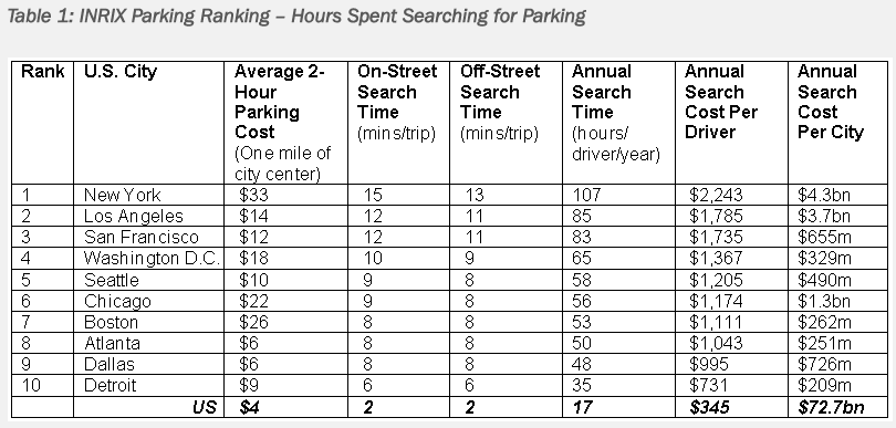 Today, one of the biggest headaches for civil planners is the growth of traffic congestion and demand for parking, especially considering cars are one of the most inefficient and expensive assets owned by Americans. According to the Governors Highway Safety Association, the average private car is parked 95% of the time. Billions of dollars of real estate in America is dedicated to parking. For example, in a city like Seattle, 40% of the land is consumed by parking. Furthermore, INRIX analytics estimates that more than $70 billion is spent by Americans looking for parking. The average driver wastes $345 a year in time, fuel and emissions. “Parking pain costs much more…New Yorkers spend 107 hours a year looking for parking spots at a cost of $2,243 per driver,” states INRIX.