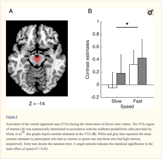 Last January, Toyota Research published a report on the neurological effects of speeding. The team displayed images and videos of sports cars racing down highways that showed spikes in brain activity. The study states, “we hypothesized that sensory inputs during high-speed driving would activate the brain reward system. Humans commonly crave sensory inputs that give rise to pleasant sensations, and abundant evidence indicates that the craving for pleasant sensations is associated with activation within the brain reward system.” The brain reward system is directly correlated to the body’s release of dopamine via the Ventral Tegmental Area. The findings confirmed that higher levels of brain activity on the VTA “were stronger in the fast condition than in the slow condition.” Essentially, speeding (which most drivers engage in regardless of laws) is addicting as the brain rewards such aggressive behaviors with increased levels of dopamine.
