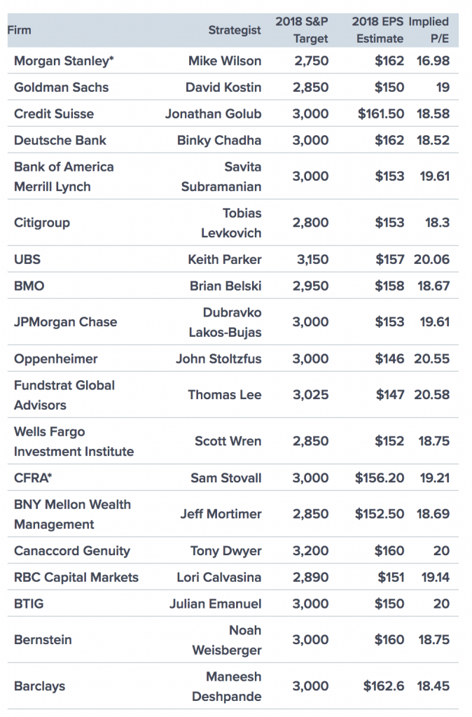 The stock market is the same as weather. While the weather channel never trots out weather experts to tell is where the weather is going to be in three months, CNBC fills its day with analysts projecting out three months or longer. Below is a chart with 19 predictions (as of September 5th, when the S&P was at 2,886) for where the S&P was going to finish the year: