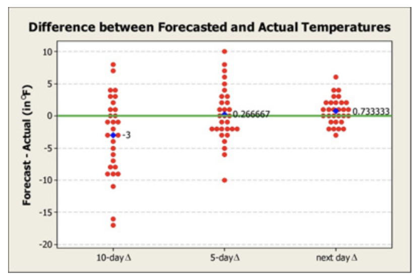 I know that every day on CNBC, you’ll see stock market strategists giving forecasts of where the market is going to be in 3, 6, or 12 months. Yet, we don’t get 3, 6, or 12-month forecasts for the weather on the Weather Channel? The weather channel forecast out that long, because that’s not a thing that has any predictive value. While meteorologists can forecast one day out pretty well, by 10 days out, the variance is pretty significant:
