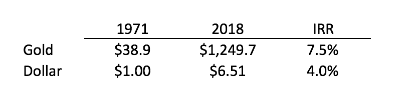 So what cost $1 in 1971 costs $6.51 today. It turns out the dollar is a terrible store of value. Gold, on the other hand, has held its value well since 1971 when we went off the gold standard and gold began its transition to being a store of value: