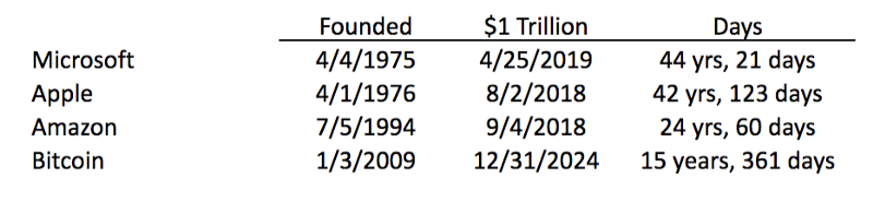 While $1 trillion is a hard number to comprehend, I get comfort by the fact that the three largest companies in the U.S. biggest companies (Apple, Microsoft, Amazon) all recently reached $1 trillion market cap. So we know that things can grow to that level in value. If Bitcoin achieves $1 trillion market cap in 2024, it will crush all current records in terms of years to $1T