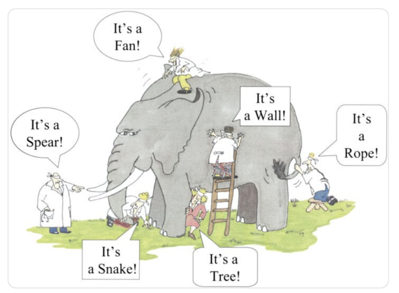 I wrote about this in detail in a post in March. The simple truth is that everyone has a prism through which they see the world, based on their life experience. This thought is well communicated in the ancient Indian tale of the five blind men and the elephant: