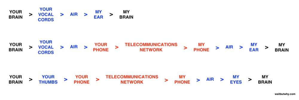 While the top three chains represent traditional media, the bottom is neuralink communication. Neuralink is argued as simply another media form because it cuts out all the intermediate steps like ‘my phone’ or ‘air’.