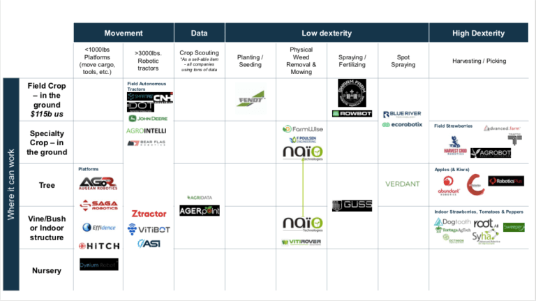 While many financial analysts have projected uber growth for agritech, the present reality is stymied by long sale cycles and difficult operating environments. As Andersen explains, “On the challenges side, the average age of a US farmer is 58 and these rising ages correlate with consolidation and an ever-smaller number of larger operators.  Simultaneously, the conditions are often very challenging for autonomy, with lighting/weather/field variability/harshness that robots must face and handle consistently over and over again, the diversity of each industry makes finding industries with large TAMs difficult, and developing solutions that scale from one industry to another, is quite difficult.” At the same time, the opportunities could be larger than the other areas of autonomy as unmanned farm vehicles are able to immediately navigate around workers without regulations, pedestrians and other obstacles.