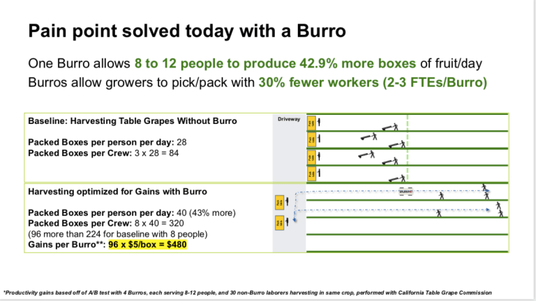 Rather than replacing humans, AGR’s approach is to alleviate today’s agronomy inefficiencies by augmenting farmhands with mechanical donkeys called Burros. “We are doing something different,” boasts the entrepreneur, “taking a stepped or phased approach towards full autonomy, beginning with a collaborative robotic platform called Burro that helps people work more productively today, collects tons of data, over time can be modularly expanded towards fully autonomous farming in a variety of different settings, and which we can get into the market today, not 5 years from now.” After observing how table grapes were picked and collected, Andersen launched a self-driving wheelbarrow to autonomously steer through vineyard rows as a shopping cart for harvesters. He further elaborates, “We’ve found that, like Kiva systems in Amazon Warehouses, if you automate in field transit you can enable people doing high-value/high-dexterity work like picking to be much more productive – a crew of ten people harvesting table grapes with one of our robots running them back and forth can pick 40% more fruit per day, and the payback on one of our robots is accordingly just 30 and 40 days.” Longterm he hopes to translate his success in table grapes to other labor-intensive crops such as berries and orchard fruits. In fact, his biggest worry as a startup is scaling his team to keep up with demand. “Every grower that buys our robots starts asking about 5 other use cases, often in different crops, that we didn’t imagine our Burros going in to, and we have to ensure that our autonomy functions consistently and reliably everywhere,” quips the Chief Executive. He imagines a robotic herd shaping into a complete farming logistics platform over the next few years, “In 5 years, I see our Burro robots forming the core API for many of the future autonomous tasks people would like in specialty crops.  By mastering the process of moving from A to B in complex farming settings, with a powerful and modular autonomous platform, I believe we are building a tool carrying platform that can enable autonomous picking, pruning, weeding, spot spraying, and a host of other tasks.”