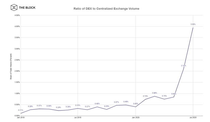Decentralized exchanges (DEXs) have also grown their share of trading volume 4X+ over the last two months:
