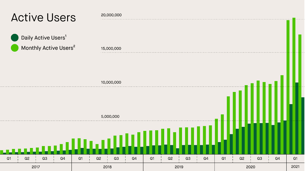 Robinhood created its app with the intention of ‘democratizing finance for all’, and it’s clear that the platform has resonated with retail investors – with around 20 million monthly active users recorded at the beginning of 2021.