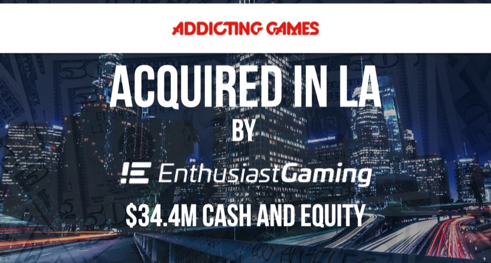 Addicting Games, a maker of casual games, has agreed to be acquired by Enthusiast Gaming, a publicly traded (TSX:EGLX) community platform for gamers and esports fans that reaches over 300M per month. The transaction is a combination of stock and equity with an initial $10M in cash, $12M in stock, and the remainder as deferred payments. “We’re excited to join the Enthusiast Gaming family,” remarked Bill Karamouzis, CEO and Cofounder of Addicting Games. “Combining Enthusiast Gaming’s scale and expertise with our properties and titles will increase engagement, drive new revenue opportunities, and provide the resources to develop new titles and fan experiences.”