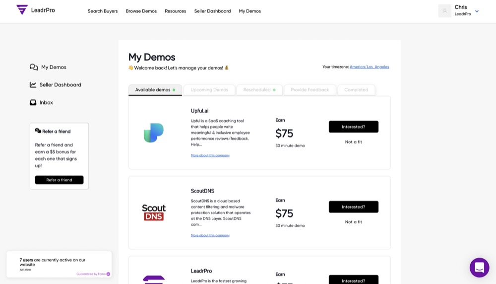 The sales demo is one of the most critical parts of the sales cycle for B2B SaaS products.  It’s central to the process because it allows the prospect to see how they would use the product and how it would solve his/her business need.  However, getting to a meeting is a tricky part for sellers in a sea of solutions vying for attention out there and with limited bandwidth on the part of the buyer.  LeadrPro is a software marketplace for B2B software that directly incentivizes the buyer with cash to participate in sales demos.  Not only is the buyer able to discover relevant solutions through the marketplace but they are able to be compensated for their attention.  Sellers get access to qualified prospects which they approve before the demo as well as get valuable feedback, invaluable for emerging companies as they flush out their offering.  Sellers are charged between $150-$250 per qualified demo depending on the plan that meets their needs. With LeadrPro, companies can think about replacing their manual and expensive SDR efforts.