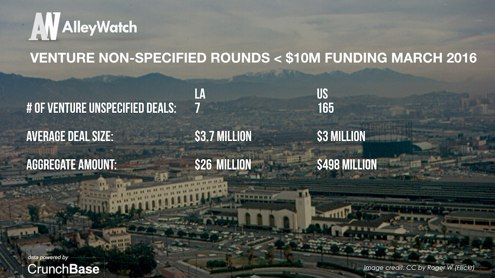 <p style="text-align: center;"><a href="https://www.latechwatch.com/wp-content/uploads/2016/04/LA-TechWatch-March-2016-Los-Angeles-and-US-Venture-Capital-Angel-Investment-Report.002.jpeg" rel="attachment wp-att-4540"><img class="aligncenter size-full wp-image-4540" src="https://www.latechwatch.com/wp-content/uploads/2016/04/LA-TechWatch-March-2016-Los-Angeles-and-US-Venture-Capital-Angel-Investment-Report.002.jpeg" alt="LA TechWatch March 2016 Los Angeles and US Venture Capital & Angel Investment Report.002" /></a></p> Today, I take a look at the state of <strong>venture capital and angel funding</strong> during the all of March, both in <strong>Los Angeles</strong> and nationally. Analyzing some publicly available data from our friends at <a href="https://crunchbase.com">CrunchBase</a>, we break down the national aggregate statistics for all funding deals by stage of funding (Angel/Seed, Series A, Series B, Series C+, as well rounds that were classified venture but not specified rounds less than $10M). <h2 style="text-align: center;"><strong><a href="https://www.latechwatch.com/2016/04/the-march-2016-la-venture-capital-and-angel-funding-report/2/">CLICK HERE TO SEE THE FULL REPORT</a></strong></h2> <!--nextpage--> <p style="text-align: center;"><a href="https://www.latechwatch.com/wp-content/uploads/2016/04/LA-TechWatch-March-2016-Los-Angeles-and-US-Venture-Capital-Angel-Investment-Report.003.jpeg" rel="attachment wp-att-4542"><img class="aligncenter size-full wp-image-4542" src="https://www.latechwatch.com/wp-content/uploads/2016/04/LA-TechWatch-March-2016-Los-Angeles-and-US-Venture-Capital-Angel-Investment-Report.003.jpeg" alt="LA TechWatch March 2016 Los Angeles and US Venture Capital & Angel Investment Report.003" /></a></p> <strong>For your tweeting convenience: </strong> Average Angel/Seed round in LA for March was $780K <a href="https://ctt.ec/3fmY5">Tweet this</a> $4.7M was invested across early stages rounds in LA in March <a href="https://ctt.ec/KGoe3">Tweet this</a> Average Angel/Seed round in the US for March was $1.5M <a href="https://ctt.ec/4Ec4g">Tweet this</a> $160M was invested across early stages rounds in the US in March <a href="https://ctt.ec/feeHl">Tweet this</a> 2.9% of early stage funding nationally went to startups in LA in March <a href="https://ctt.ec/uAGee">Tweet this</a> <strong> </strong> <!--nextpage--> <p style="text-align: center;"><a href="https://www.latechwatch.com/wp-content/uploads/2016/04/LA-TechWatch-March-2016-Los-Angeles-and-US-Venture-Capital-Angel-Investment-Report.004.jpeg" rel="attachment wp-att-4543"><img class="aligncenter size-full wp-image-4543" src="https://www.latechwatch.com/wp-content/uploads/2016/04/LA-TechWatch-March-2016-Los-Angeles-and-US-Venture-Capital-Angel-Investment-Report.004.jpeg" alt="LA TechWatch March 2016 Los Angeles and US Venture Capital & Angel Investment Report.004" /></a></p> <strong>For your tweeting convenience:</strong> Average Series A round in LA for March was $12M <a href="https://ctt.ec/3ie5F">Tweet this</a> $60M was invested across Series A rounds in LA in March <a href="https://ctt.ec/17dxV">Tweet this</a> Average Series A round in the US for March was $10.3M <a href="https://ctt.ec/1vdCT">Tweet this</a> $638M was invested across Series A rounds in the US in March <a href="https://ctt.ec/94eBs">Tweet this</a> 9.4% of Series A funding nationally went to startups in LA in March <a href="https://ctt.ec/U9bk0">Tweet this</a> <!--nextpage--> <p style="text-align: center;"><a href="https://www.latechwatch.com/wp-content/uploads/2016/04/LA-TechWatch-March-2016-Los-Angeles-and-US-Venture-Capital-Angel-Investment-Report.005.jpeg" rel="attachment wp-att-4544"><img class="aligncenter size-full wp-image-4544" src="https://www.latechwatch.com/wp-content/uploads/2016/04/LA-TechWatch-March-2016-Los-Angeles-and-US-Venture-Capital-Angel-Investment-Report.005.jpeg" alt="LA TechWatch March 2016 Los Angeles and US Venture Capital & Angel Investment Report.005" /></a></p> <strong>For your tweeting convenience:</strong> Average Series B round in LA for March was $35M <a href="https://ctt.ec/ic9H3">Tweet this</a> $35M was invested across Series B rounds in LA in March <a href="https://ctt.ec/1ieng">Tweet this</a> Average Series B round in the US for March was $16.7M <a href="https://ctt.ec/6pxOt">Tweet this</a> $670M was invested across Series B rounds in the US in March <a href="https://ctt.ec/L3eOm">Tweet this</a> 5.2% of Series B funding nationally went to startups in LA in March <a href="https://ctt.ec/01_4D">Tweet this</a> <!--nextpage--> <p style="text-align: center;"><a href="https://www.latechwatch.com/wp-content/uploads/2016/04/LA-TechWatch-March-2016-Los-Angeles-and-US-Venture-Capital-Angel-Investment-Report.006.jpeg" rel="attachment wp-att-4545"><img class="aligncenter size-full wp-image-4545" src="https://www.latechwatch.com/wp-content/uploads/2016/04/LA-TechWatch-March-2016-Los-Angeles-and-US-Venture-Capital-Angel-Investment-Report.006.jpeg" alt="LA TechWatch March 2016 Los Angeles and US Venture Capital & Angel Investment Report.006" /></a></p> <strong>For your tweeting convenience:</strong> Average Series C+ round in LA for March was $80.4M <a href="https://ctt.ec/Ly99w">Tweet this</a> $241M was invested across Series C+ rounds in LA in March <a href="https://ctt.ec/0d50d">Tweet this</a> Average Series C+ round in the US for March was $35M <a href="https://ctt.ec/6R5a6">Tweet this</a> $2.1B was invested across Series C+ rounds in the US in March <a href="https://$2.1B was invested across Series B rounds in the US in March https://latechwat.ch/1RHFKvt via @LATechWatch #startup">Tweet this</a> 11.67% of Series C+ funding nationally went to startups in LA in March <a href="https://ctt.ec/db4J4">Tweet this</a> <strong> </strong> <!--nextpage--> <p style="text-align: center;"><a href="https://www.latechwatch.com/wp-content/uploads/2016/04/LA-TechWatch-March-2016-Los-Angeles-and-US-Venture-Capital-Angel-Investment-Repo