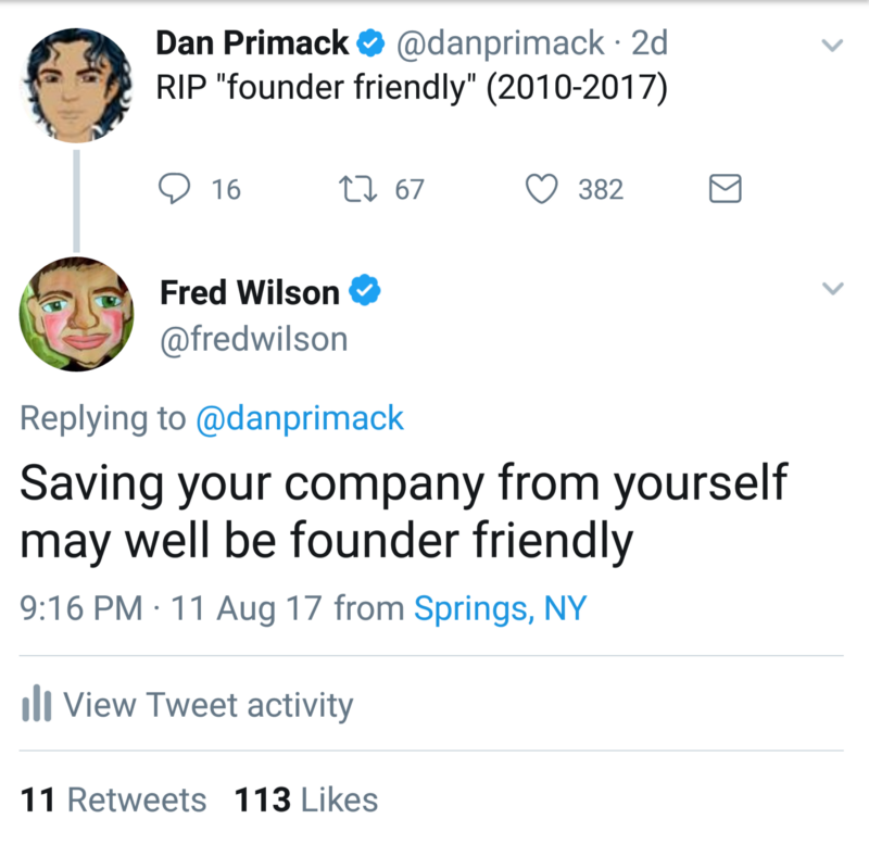 I’m not really too concerned about it because it’s late stage and I deal with early. I am worried though when a top industry journalist (who broke the lawsuit story) tweets that “founder friendly” is dead based on a literal unicorn problem.