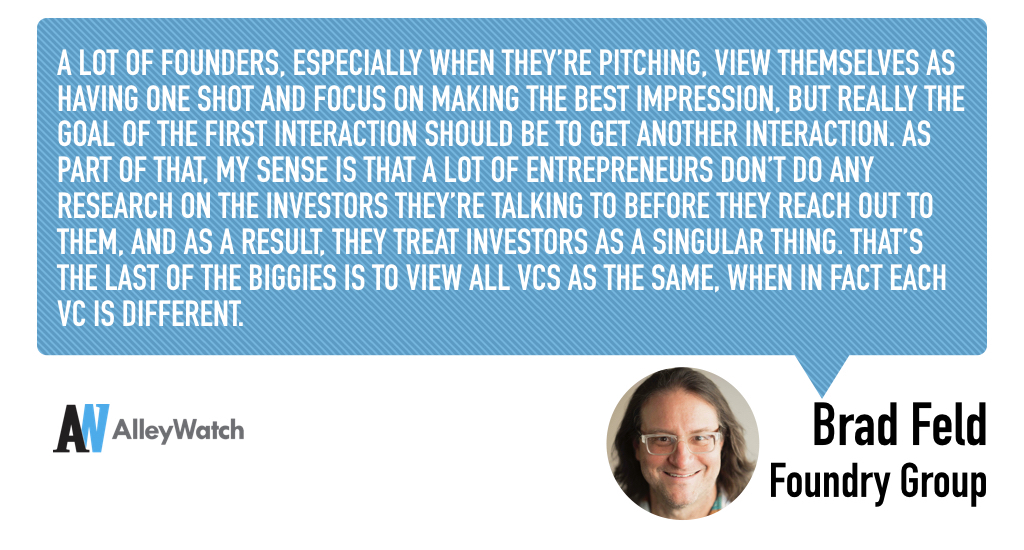 A lot of founders, especially when they’re pitching, view themselves as having one shot and focus on making the best impression, but really the goal of the first interaction should be to get another interaction. As part of that, my sense is that a lot of entrepreneurs don’t do any research on the investors they’re talking to before they reach out to them, and as a result, they treat investors as a singular thing. That’s the last of the biggies is to view all VCs as the same, when in fact each VC is different.