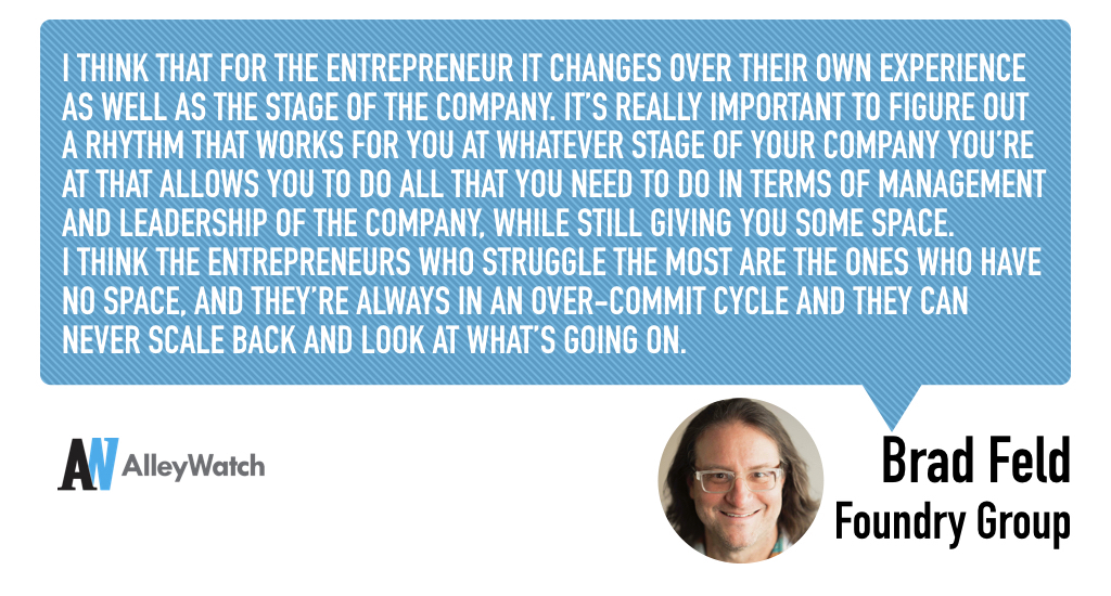 I think that for the entrepreneur it changes over their own experience as well as the stage of the company. It’s really important to figure out a rhythm that works for you at whatever stage of your company you’re at that allows you to do all that you need to do in terms of management and leadership of the company, while still giving you some space.