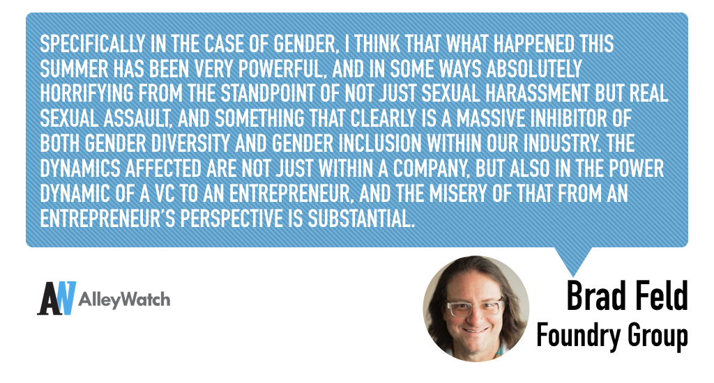 Specifically in the case of gender, I think that what happened this summer has been very powerful, and in some ways absolutely horrifying from the standpoint of not just sexual harassment but real sexual assault, and something that clearly is a massive inhibitor of both gender diversity and gender inclusion within our industry. The dynamics affected are not just within a company, but also in the power dynamic of a VC to an entrepreneur, and the misery of that from an entrepreneur’s perspective is substantial.