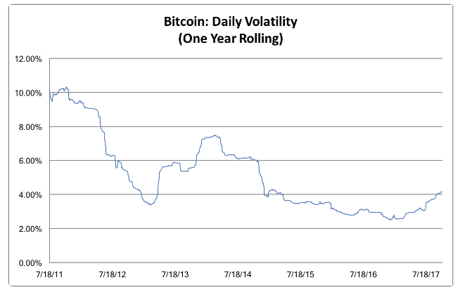 Chris Burniske posted a great graph on Twitter showing the long term decline in daily volatility of Bitcoin over the last six years: