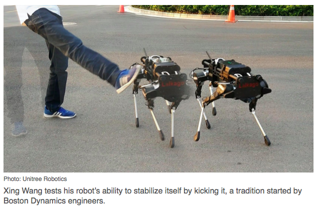 Boston Dynamics is not the only quadruped provider; recent upstarts have entered the market by utilizing Raibert’s research as an inspiration for their own bionic creatures. Chinese roboticist Xing Wang is unabashed in his gushing admiration for the founder of Boston Dynamics, “Marc Raibert … is my idol,” he said a recent interview with IEEE Spectrum Magazine. However, his veneration for Raibert has not stopped him from founding a competitive startup. Unitree Robotics aims to create quadruped robots that are as affordable as smartphones and drones. While Boston Dynamics has not sold its robots commercially, many have speculated that their current designs would cost hundreds of thousands of dollars. In the spirit of true flattery, Unitree’s first robot is, of course, a quadruped dog named Laikago. Wang aims to sell Laikago for under $30,000 dollars to science museums and eventually as companion robots. When comparing his product to Raibert’s, Wang said he wanted to “make quadruped robots simpler and smaller, so that they can help ordinary people with things like carrying objects or as companions.” Wang boasts of Laikago’s 3-degrees-of-freedom (forward, backward, and sideways), its ability to scale rough terrain, and pass anyone’s kick test.