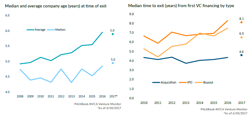 This is just simple pre-seed/seed math, which changes a little when you start to get into the $100M+ funds. And as you can see here from PitchBook, times to exit/IPO continue to increase thanks to them staying private longer aka The SoftBank Effect.