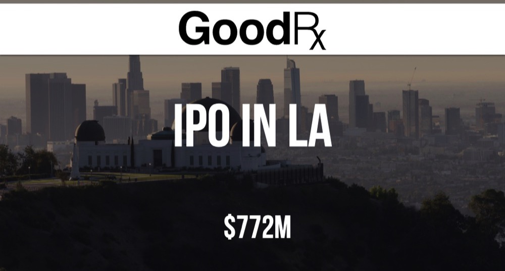 GoodRx, the prescription drug savings platform, debuted on the Nasdaq; raising $772M in its IPO. The company trades under the ticker GDRX and closed the week with a $19.86B market cap. The company was founded by Doug Hirsch, Scott Marlette, and Trevor Bezdek in 2011 and had raised a total of $850.3M in total funding prior the IPO. Pre-IPO investors in the company include SV Angel, Founders Fund, Lerer Hippeau, Highland Capital Partners, Upfront Ventures, Spectrum Equity, Silver Lake, Francisco Partners, Michael Ovitz, and Dawn Lepore.