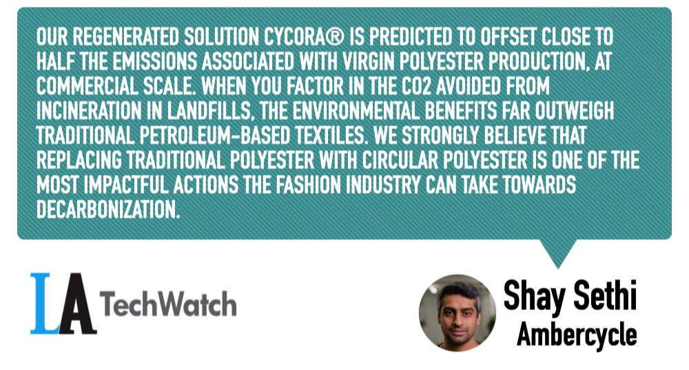 It’s estimated that 92 million tons of textile waste is created each year by the fashion industry.  A toxic system of overproduction and overconsumption is ensuring that this waste will continue to increase with textile waste expected to surge 60% per year by 2030.  Circular fashion seeks to extend the life of our clothes as well as through recycling, but recycling is notoriously inefficient.  Ambercycle is building true circularity through textile regeneration with its material science technology.  The company has developed its own fiber, cycora, by separating polyester from cottons and other fibers at a molecular level, purifying the separated polyester material, and treating it.  Polyester itself is very carbon-intensive to develop initially and cycora can be regenerated over and over, leading to true circularity. In traditional recycling, only a small portion of material can be recycled and these recycled materials are typically used in things like furniture stuffing or insulation with limited use beyond.  Ambercycle has worked with brands like GANNI, ZARA, Saucony, TOMBOGO, and Kozaburo to ensure their products don’t end up in landfills.