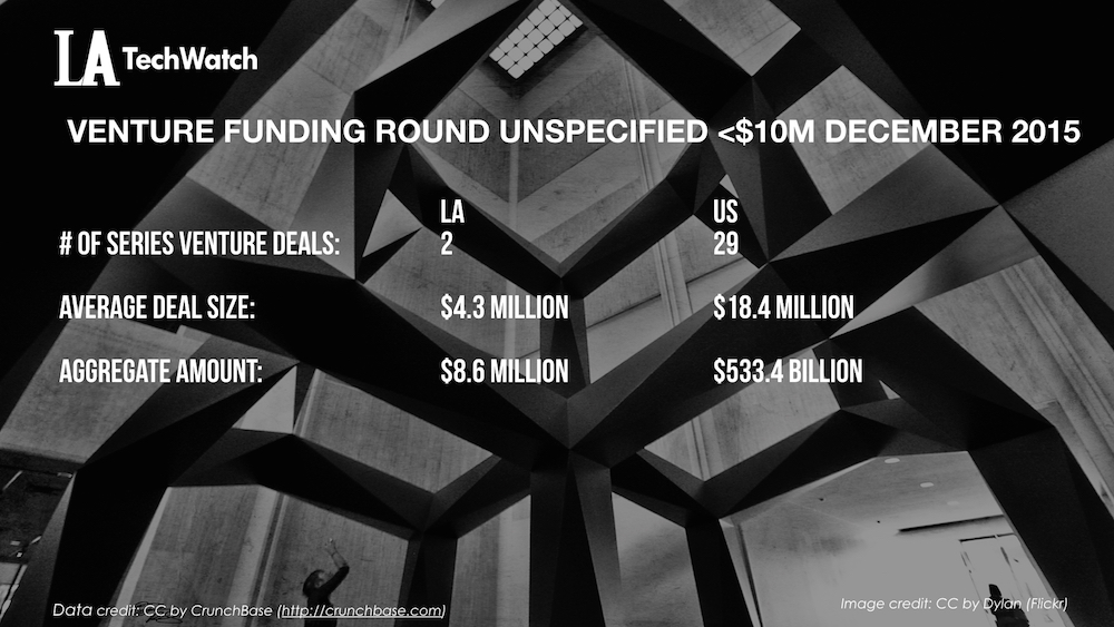 <p style="text-align: center;"><a href="https://www.latechwatch.com/wp-content/uploads/2016/01/LA-TechWatch-December-2015-LA-and-US-Venture-Capital-Angel-Investment-Report.002.jpeg"><img class="aligncenter size-full wp-image-2824" src="https://www.latechwatch.com/wp-content/uploads/2016/01/LA-TechWatch-December-2015-LA-and-US-Venture-Capital-Angel-Investment-Report.002.jpeg" alt="LA TechWatch December 2015 LA and US Venture Capital & Angel Investment Report.002" /></a></p> Today, we take a look at the state of <strong>venture capital and angel funding</strong> during the all of December, both in <strong>Los Angeles</strong> and nationally. Analyzing some publicly available data from our friends at <a href="https://crunchbase.com">CrunchBase</a>, we break down the national aggregate statistics for all funding deals by stage of funding (Angel/Seed, Series A, Series B, and Series C+). <h2 style="text-align: center;"><a href="https://www.latechwatch.com/2016/01/the-december-2015-la-venture-capital-and-angel-funding-report/2/"><strong>CLICK HERE TO SEE THE FULL REPORT</strong></a></h2> <h2 style="text-align: center;"></h2> <!--nextpage--> <p style="text-align: center;"><a href="https://www.latechwatch.com/wp-content/uploads/2016/01/LA-TechWatch-December-2015-LA-and-US-Venture-Capital-Angel-Investment-Report.003.jpeg"><img class="aligncenter size-full wp-image-2825" src="https://www.latechwatch.com/wp-content/uploads/2016/01/LA-TechWatch-December-2015-LA-and-US-Venture-Capital-Angel-Investment-Report.003.jpeg" alt="LA TechWatch December 2015 LA and US Venture Capital & Angel Investment Report.003" /></a></p> <strong>For your tweeting convenience:</strong> $128M was invested in angel and venture financing for #startups in December in LA across 9 deals <a href="https://ctt.ec/vkOY9">Tweet this</a> $4.5B was invested in angel and venture financing for #startups in December in the US across 396 deals <a href="https://ctt.ec/hdU5W">Tweet this</a> <!--nextpage--> <p style="text-align: center;"><a href="https://www.latechwatch.com/wp-content/uploads/2016/01/LA-TechWatch-December-2015-LA-and-US-Venture-Capital-Angel-Investment-Report.004.jpeg"><img class="aligncenter size-full wp-image-2826" src="https://www.latechwatch.com/wp-content/uploads/2016/01/LA-TechWatch-December-2015-LA-and-US-Venture-Capital-Angel-Investment-Report.004.jpeg" alt="LA TechWatch December 2015 LA and US Venture Capital & Angel Investment Report.004" /></a></p> <strong>For your tweeting convenience: </strong> Average Angel/Seed round in LA for December was $1M <a href="https://ctt.ec/251Kf">Tweet this</a> $3.1M was invested across early stages rounds in LA in December <a href="https://ctt.ec/0a3aE">Tweet this</a> Average Angel/Seed round in the US for December was $1.1M <a href="https://ctt.ec/xwacV">Tweet this</a> $146M was invested across early stages rounds in the US in December <a href="https://ctt.ec/f4sti">Tweet this</a> <strong> </strong> <!--nextpage--> <p style="text-align: center;"><a href="https://www.latechwatch.com/wp-content/uploads/2016/01/LA-TechWatch-December-2015-LA-and-US-Venture-Capital-Angel-Investment-Report.005.jpeg"><img class="aligncenter size-full wp-image-2827" src="https://www.latechwatch.com/wp-content/uploads/2016/01/LA-TechWatch-December-2015-LA-and-US-Venture-Capital-Angel-Investment-Report.005.jpeg" alt="LA TechWatch December 2015 LA and US Venture Capital & Angel Investment Report.005" /></a></p> <p style="text-align: center;"><!--nextpage--></p> <p style="text-align: center;"><a href="https://www.latechwatch.com/wp-content/uploads/2016/01/LA-TechWatch-December-2015-LA-and-US-Venture-Capital-Angel-Investment-Report.006.jpeg"><img class="aligncenter size-full wp-image-2828" src="https://www.latechwatch.com/wp-content/uploads/2016/01/LA-TechWatch-December-2015-LA-and-US-Venture-Capital-Angel-Investment-Report.006.jpeg" alt="LA TechWatch December 2015 LA and US Venture Capital & Angel Investment Report.006" /></a></p> <strong>For your tweeting convenience:</strong> Average Series A round in LA for December was $10M <a href="https://ctt.ec/_dMf8">Tweet this</a> $10M was invested across Series A rounds in LA in December <a href="https://ctt.ec/2Dyee">Tweet this</a> Average Series A round in the US for December was $8.4M <a href="https://ctt.ec/8oLNx">Tweet this</a> $475M was invested across Series A rounds in the US in December <a href="https://ctt.ec/vxQde">Tweet this</a> <!--nextpage--> <p style="text-align: center;"><a href="https://www.latechwatch.com/wp-content/uploads/2016/01/LA-TechWatch-December-2015-LA-and-US-Venture-Capital-Angel-Investment-Report.007.jpeg"><img class="aligncenter size-full wp-image-2830" src="https://www.latechwatch.com/wp-content/uploads/2016/01/LA-TechWatch-December-2015-LA-and-US-Venture-Capital-Angel-Investment-Report.007.jpeg" alt="LA TechWatch December 2015 LA and US Venture Capital & Angel Investment Report.007" /></a></p> <strong>For your tweeting convenience:</strong> Average Series C+ round in LA for December was $35.5M <a href="https://ctt.ec/4jNdx">Tweet this</a> $106.5M was invested across Series C+ rounds in LA in December <a href="https://ctt.ec/s37Py">Tweet this</a> Average Series C+ round in the US for December was $82.8M <a href="https://ctt.ec/uefk0">Tweet this</a> $1.7B was invested across Series C+ rounds in the US in December <a href="https://ctt.ec/3YeHe">Tweet this</a>