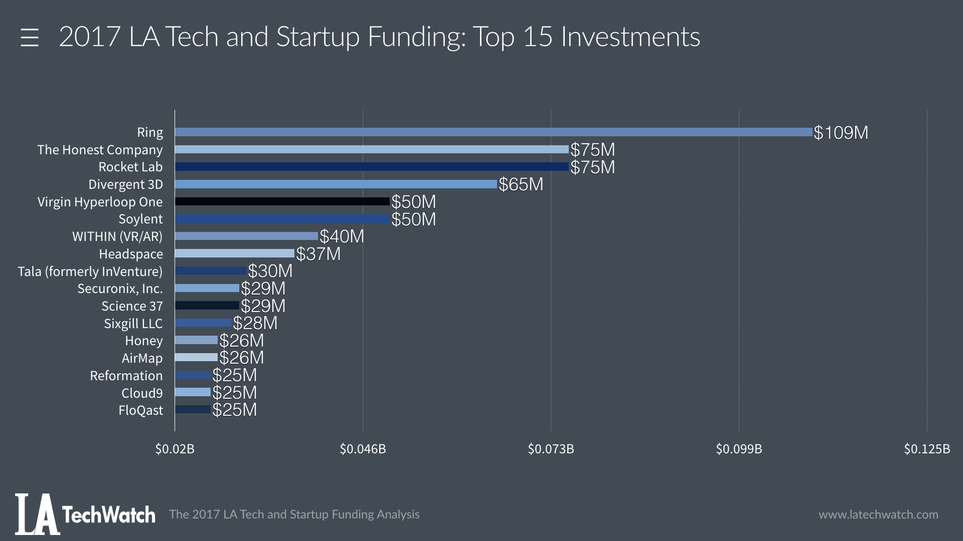 Now we take a look at the LA Startup fundings that were the largest for the year. These deals largely contributed to total funding for 2017.